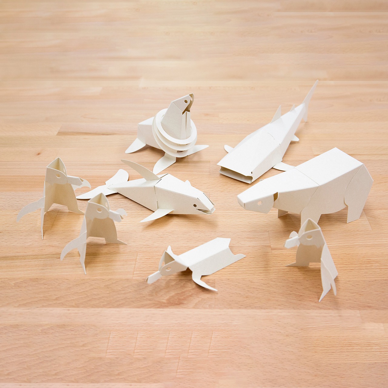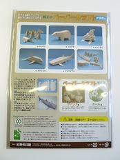 ハサミも糊もテープも使わずにつくれる! エコ間伐紙使用のペーパークラフト「水族館編」 エコ間伐紙を使用したオリジナルのペーパークラフトの第3弾、水族館の人気者を揃えた「水族館編」です。 内容は… 水族館の人気者、ペンギン、ジンベイザメ、オットセイ、シロクマ、カマイルカの5種類。 パーツごとに切りこみが入っていて、折る部分には折りスジがついているので、ハサミも糊もテープも使わずに、組み立てはカンタンです。できあがったら自由に色をぬって、自分だけのオリジナル動物が完成!!